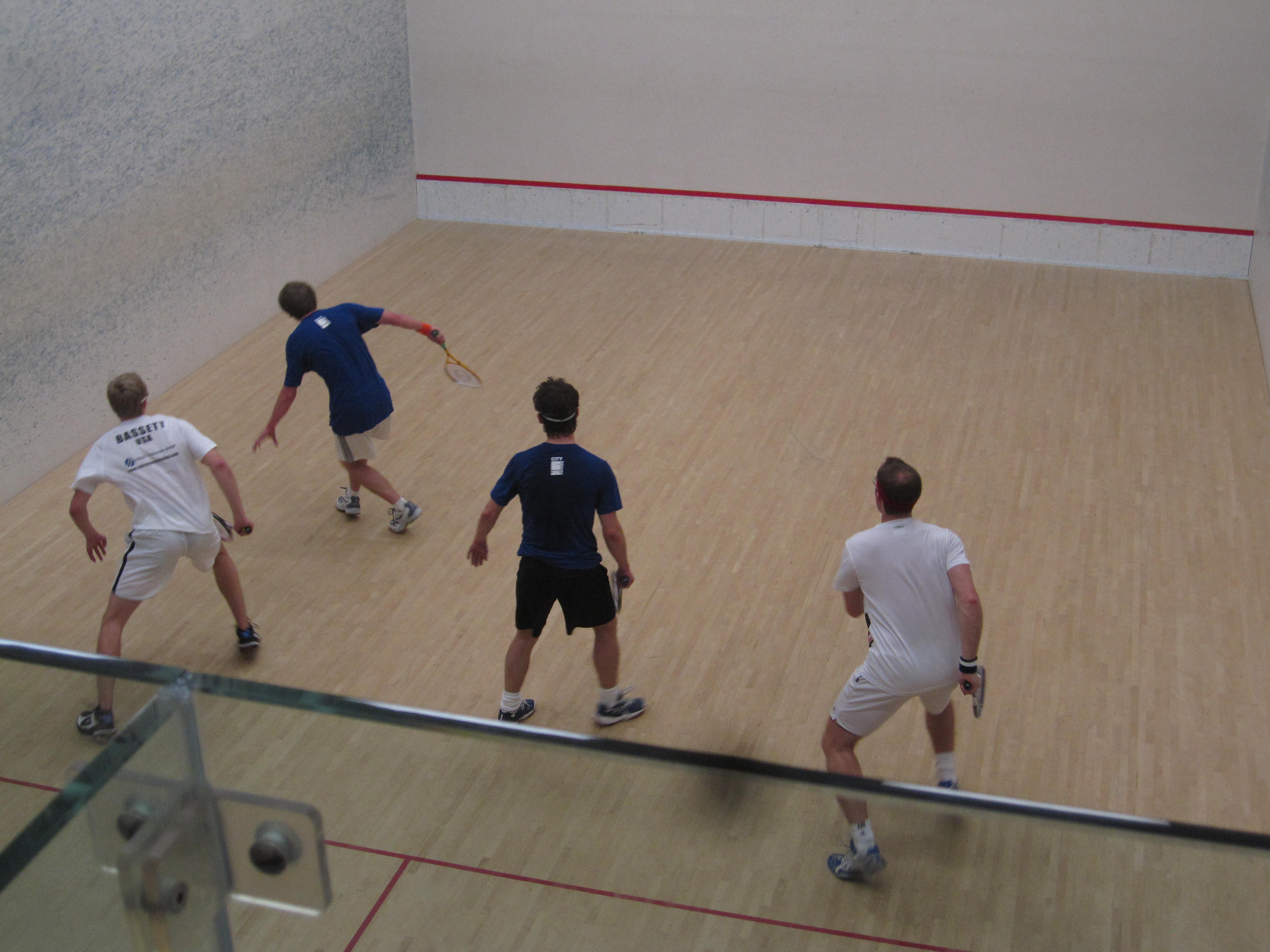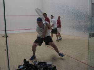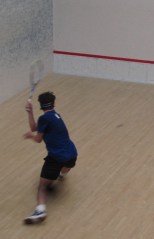 I took an early look at some of the competition in the Qualifying Draw on Friday as I knew players in the first three matches. Watching doubles is hard work in the morning though, so I was glad that I had picked up a latte and a muffin across the avenue at Le Pain Quotidian. The caffeine and carbs helped me focus on the first match featuring Nanda/Khan vs. Baglio/Erasmus, also known as touch vs. power. Nanda and Khan were more in control of the ball than their opponents and ran Baglio, playing left wall, all over the court, hitting a good percentage of their shots in his territory. But some players seem made to be great retrievers and Baglio’s fitness and speed, combined with his quick reflexes, are a good match for his partner’s impressive power. Unfortunately, quick reflexes don’t always mean perfect placement and many of Baglio’s shots put the ball more to the middle of the court where Khan (also left wall) could put the ball away with a reverse corner or volley drop, or a nice lob to the back to get Baglio out of position. And Khan was also getting a high percentage of nicks. As a novice doubles player and observer myself, I’m not sure how he does it, but I’d be willing to bet they aren’t just lucky.