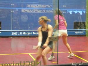 Happily, she doesn’t feel the need to hide her personality off the court. It’s friendly, approachable, and the game face is completely gone, replaced with one of a teenager excited to be in New York Cityfor the first time. After her five game loss (6-11,11-5, 11-5,7-11,11-4) to Natalie Grinham in the Semis last night, she sits down with me on a bench beneath the bleachers to discuss the match.