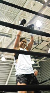 Or were they? Most of my non-squash playing friends think I’m nuts to get in an enclosed room with another person, wield two lethally hard objects, and then whip them around next to each other. We may wear eye protection, but there’s no mouth guard, and a racquet’s a lot more destructive than a couple of padded mitts! Squash players are perhaps braver than I thought . . . but than I recalled a single moment last fall. Playing a game of hardball doubles with some friends, I watched dumbly as one of my opponents followed the ball around the back wall, wound up her forehand, and let the ball fly off of her racquet . . . straight into my neck, and so hard it left a long red skid mark that lasted for weeks. I barely lasted a second on the court, the equivalence of a knock-out. Clearly, I needed more practice, as well as more guts. I eventually got back on the doubles court, but the jury’s out on whether I’ll ever have what it takes to get in a boxing ring, much less lace on some gloves. But would I like to go back, lean on the big blue mat, and watch the victorious Ms. Santiago knock someone flat? The thrill-seeker in me says yes.