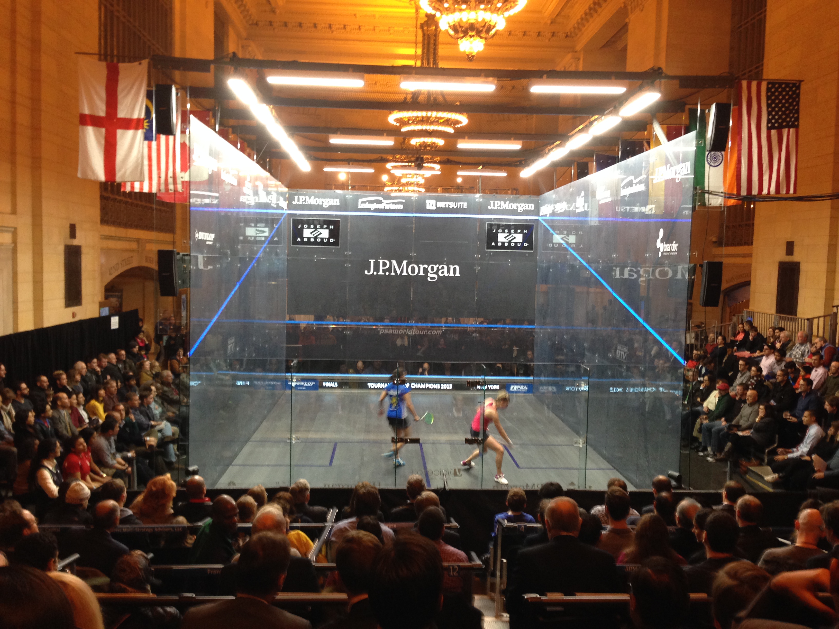 So not to be dry-mouthed during the match, I met a friend for another beer at the ToC bar, and just happened to meet a few of the people at the Women’s Squash Association (Tommy Berden, Ashley Bernhard, and Latasha Khan) who are helping to make this tournament better than ever—getting the top pro women players there, and giving them equal prize money. I’ve always been excited to watch pro men’s players on the glass court in Grand Central, but seeing my favorite women on there was truly gratifying.