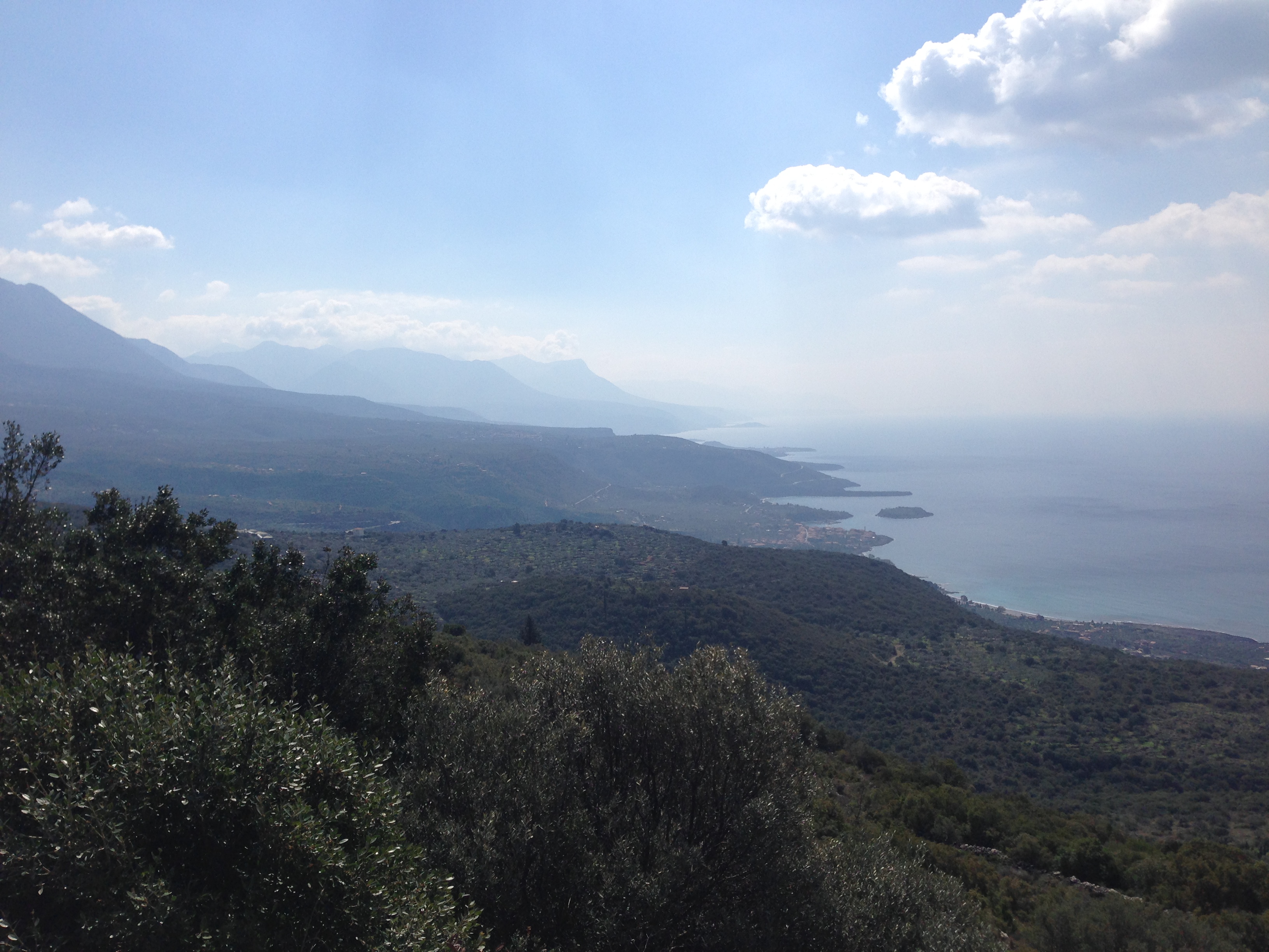 About a week later, my mother, niece, and I were zipping in our rental car through the actual city of Kalamata, on our way to a small town on the western coast of the Mani peninsula in the Peloponnese. On the outskirts of the city, the road narrowed and began climbing and soon I was shifting gears to round the hairpin turns, and the commercial buildings of the city faded into the cottages and farmhouses tucked into steep countryside leading upward and beyond to snow-capped mountains. With the sea glistening off to our right, it was breathtakingly picturesque. Countless hilly twists and turns later, the vista opened and we were looking out toward the sea again and a town way below nestled along on its coast. Kardamyli.